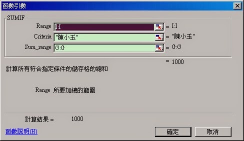 Range | 是要計算加總的儲存格範圍。 在此表中就是王小明、陳小玉的那個欄位 |