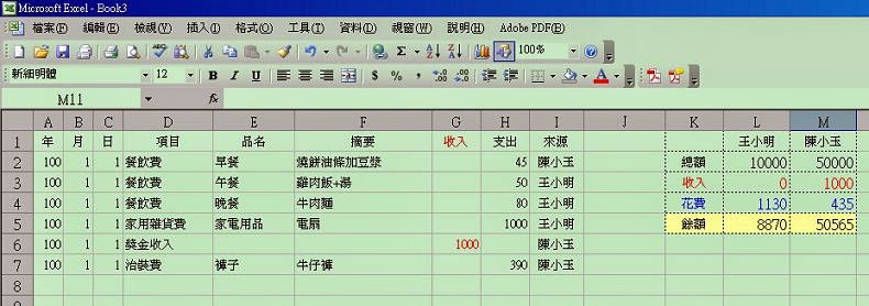 套入函數後,就可顯示圖中的右邊表格,可以依不同人支出來計算收入、花費及餘額的小計。