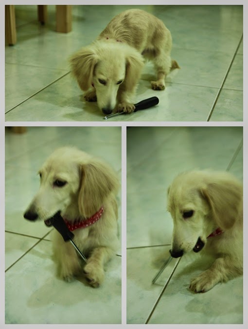 啊是沒看到我們在忙是不是,偷偷把工具咬走,自顧自的玩了起來,今害尼。