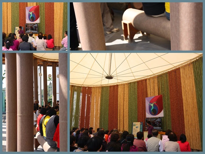 我想,假日的紙教堂應該都那麼多人吧,我們到那裡,超多團體,加上零散的遊客,整個人很多,感覺很熱鬧,但缺點是,很難拍照,不管怎麼等,都一定會拍到路人甲乙丙丁……甚至更多,哈…… 不過也沒關係,至少我們還是去了那裡並拍照留念,那就夠了。只要是團體都會進到紙教堂聽導覽,其中我記得一句話,導覽人員說,紙是柔的,卻能夠利用紙搭起教堂及可以坐的椅子,可說是柔中帶鋼;而相隔不遠另一處的建築卻使用搭鐵皮屋的材料,而將屋頂支架以圓弧形呈現,那材料是鋼的,以柔的方式表現,可說是鋼中帶柔,所以二項建築為柔中帶鋼、鋼中帶柔的表現,很有趣厚。