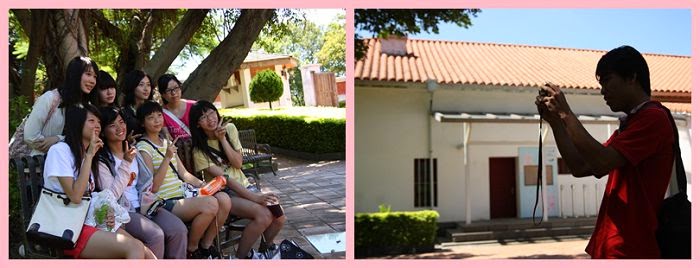 坐在椅子的我們,看著一旁應該是一群學生們在拍照,這時我們聽到其中一個女生說我們來拍合照,但要找誰來幫我們拍,這時凱自告奮勇向前表示願意幫忙,他真的很善良,而我正好拿著單眼在亂拍,就在被拍及拍他們的一剎那間,我拍下了二邊的影像,回家整理後,發現這畫面,真的很有趣。希望這群學生不會來跟我說有肖像權,哈... 因為我是偷偷側拍低。
