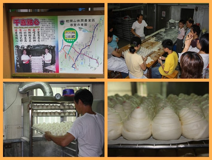 我們到那裡時,千喜點心老闆全家人正在做饅頭,看著老闆持刀以俐落的刀法先輕輕下幾刀再切,刀法之快真是出神入化。聽老闆說這是為了趕隔天幾千個的訂單.待手邊工作告一段落後,老闆拿出剛出爐的饅頭請我們品嚐,真是好吃,不過沒機會吃到紅心芭樂口味的。