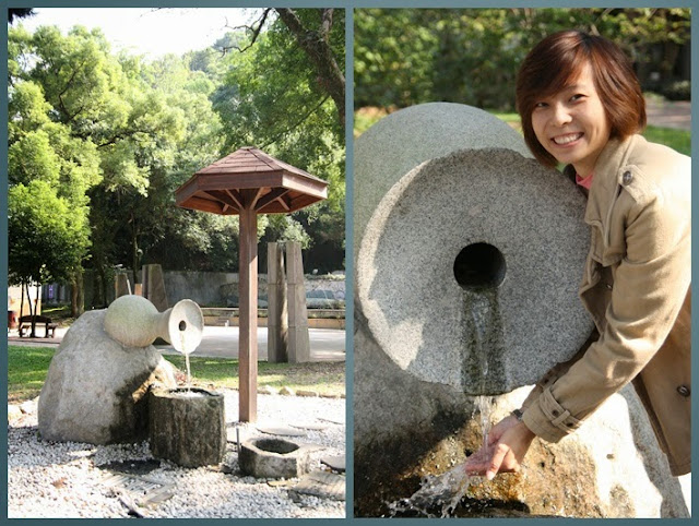拍完山清水秀碑我們往外走,整個環境就是走日式風格,我在一個石藝品那拍照,為了拍照搞的身上都是水,整個就要要求效果;接著我們走到外面有一顆大石頭刻著地理中心碑,剛好那裡有一個公車站,我們就拍起了偽等公車的感覺,哈哈,整個就很愛玩。