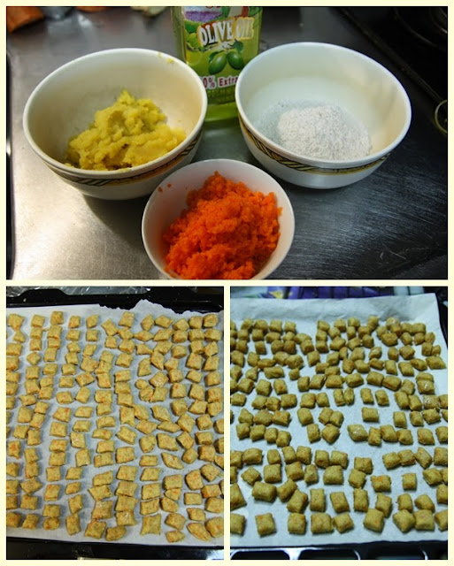 5. 將麵團桿平,並切成塊狀,放置於烤盤,入烤箱180度烤20分鐘.